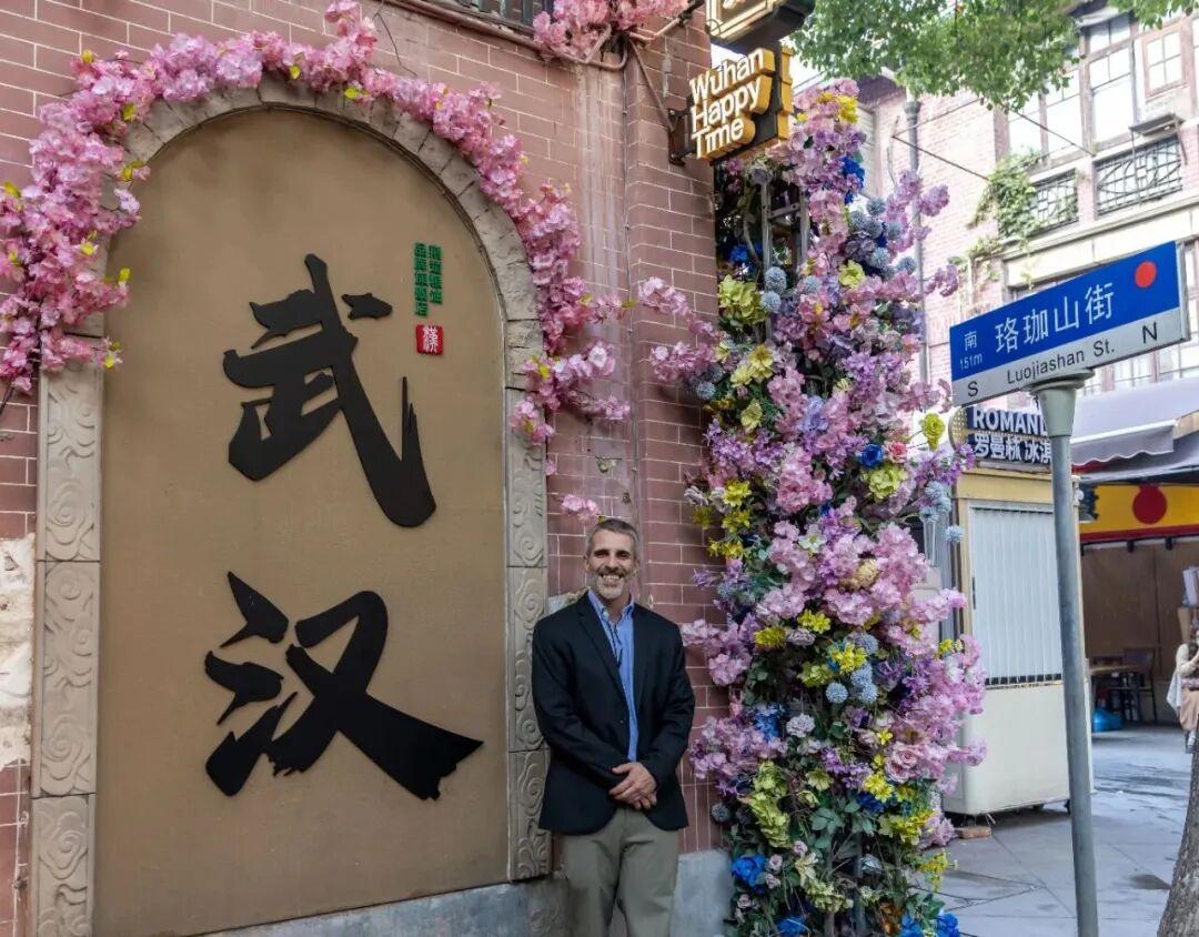 洛佩斯与印有“武汉”字样的花卉墙合影