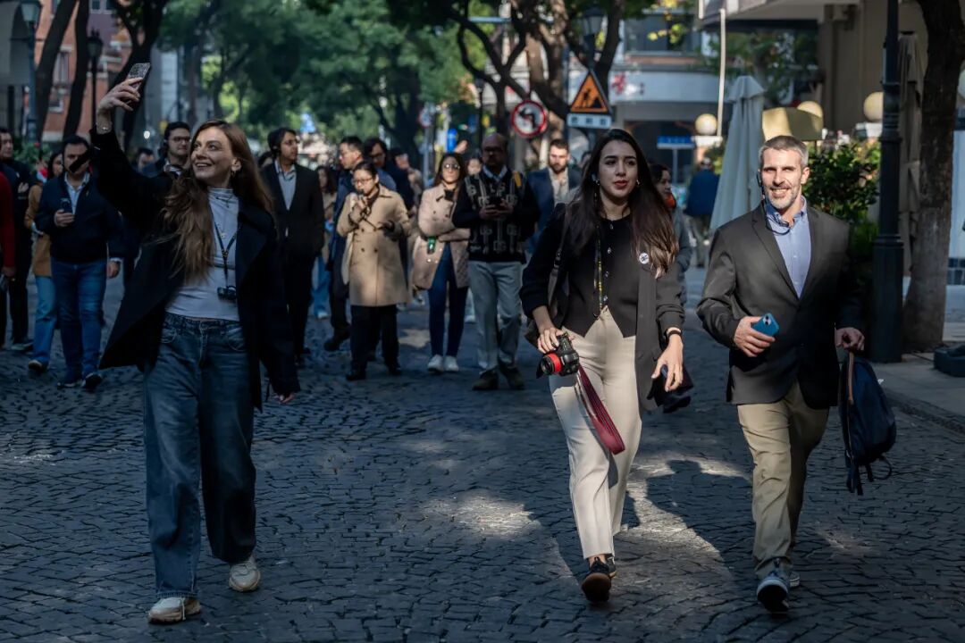 研修班成员漫步于古朴雅致的石板街道上,欣赏着两侧建筑,不时驻足拍照。来自西班牙“我们能”党的全国委员会委员保·比瓦斯·洛佩斯(Pau Vivas Lopez)惊叹于这片街区的建筑与欧洲城市中心的相似之处,“就像是回到了我的老家马德里!”途经巴公房子时,他一拍脑门说:“为啥这么眼熟?在马德里就有一座建筑简直一模一样啊!”他迅速打开手机,现场向同行者展示了位于马德里街头的一栋银行大楼的照片。