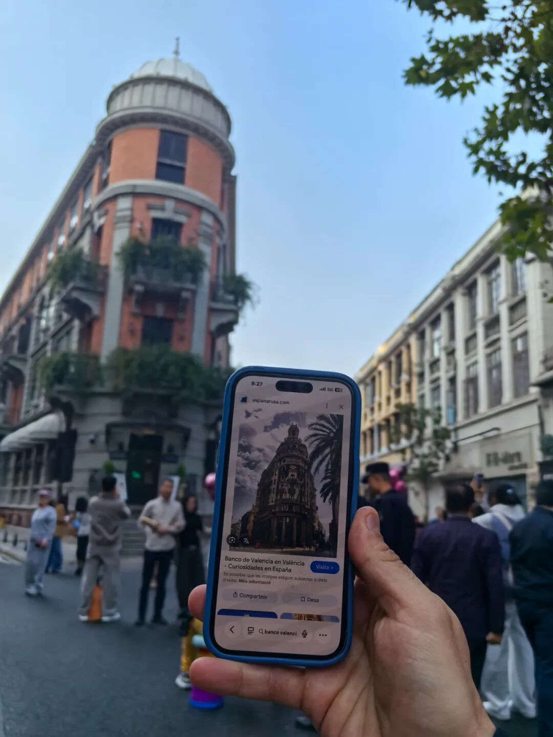 在巴公房子前,洛佩斯打开手机展示马德里街头一栋同款大楼的照片