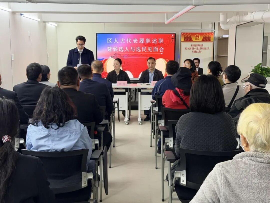 永清街道人大工委举行区人大代表履职报告暨候选人与选民见面会。代表们述职汇报履职成效,候选人结合自身工作阐述履职方向,并与选民围绕教育、交通等民生问题互动交流。