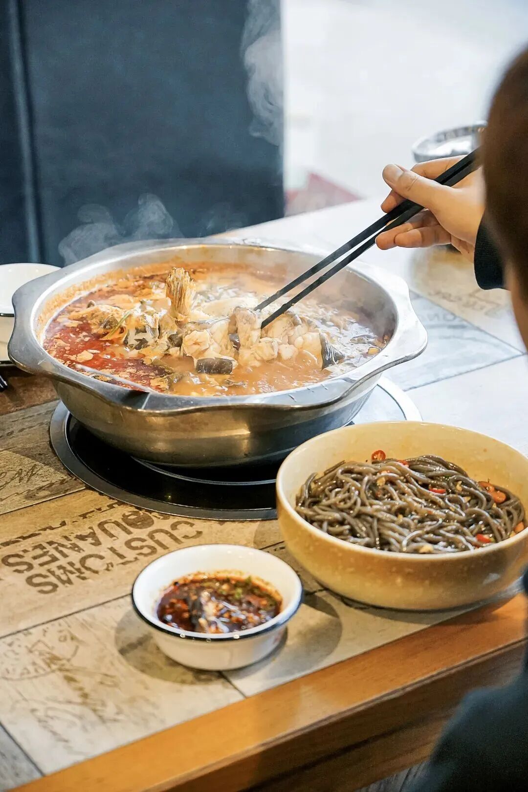 以招牌经典的酸汤鱼为例,夹起鲜嫩肥美的鱼肉,蘸上层次丰富的特色蘸料,层次丰富的香味会先入鼻腔。
