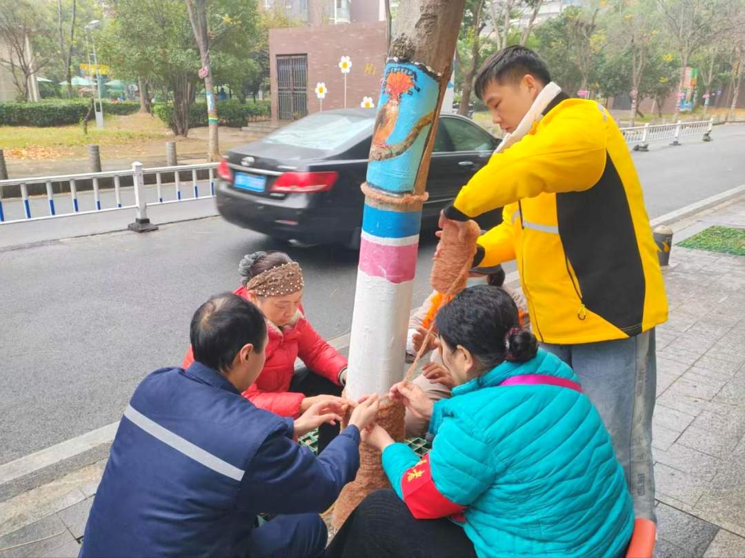 百步亭社区现代城组织“妈妈力”“急先锋”“好管家”“最美夫妻档”等志愿服务队,合力为辖区内的行道树编织“树干毛衣”,为科普长廊换装,推动苑区“颜值”与“内涵”双提升。