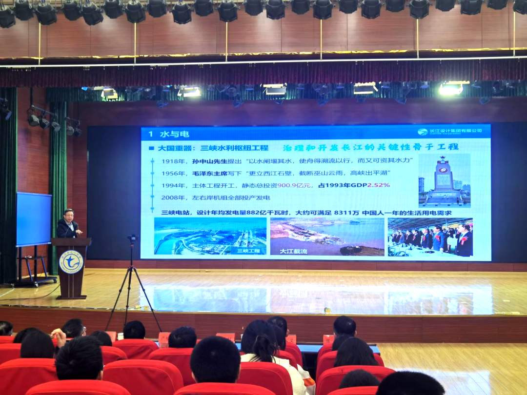 讲座伊始,翁永红以三峡水利枢纽工程为切入点,娓娓道来。从孙中山先生“以水闸堰其水,使舟得溯流以行,而又可资其水力”的宏伟构想,到毛泽东主席“更立西江石壁,截断巫山云雨,高峡出平湖”的豪迈诗句,再到工程正式开工建设、机组投产发电的辉煌成就,一段跨越百年的水电传奇在同学们眼前徐徐展开。当提及中国在全球水电行业的领军地位时,一组组翔实的数据对比令人震撼:1978年我国发电量仅为同期美国的1/8,到2023年已超美国2倍。学生们聚精会神地聆听,眼中闪烁着好奇与惊叹。