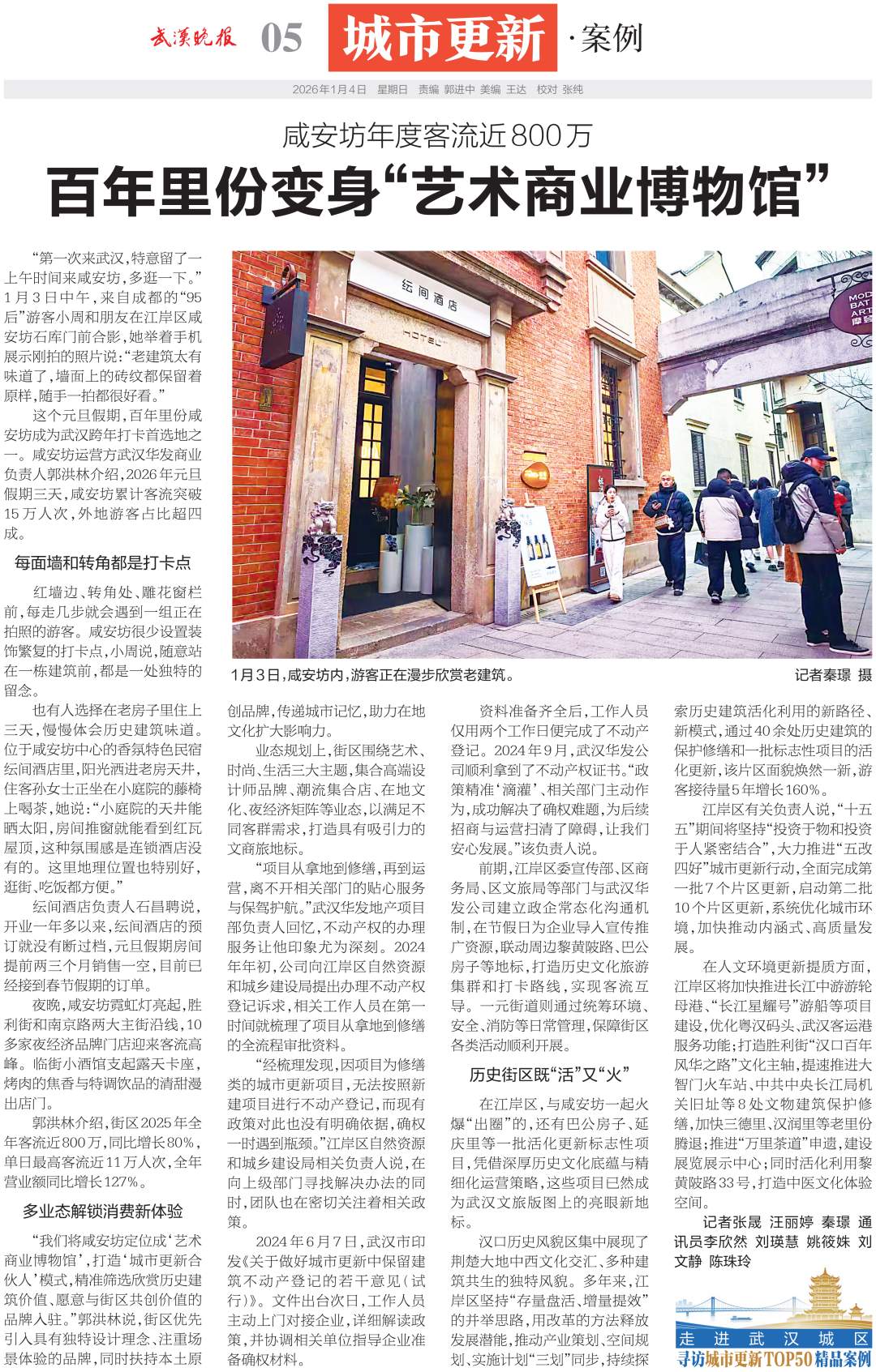 这个元旦假期,百年里份咸安坊成为武汉跨年打卡首选地之一。咸安坊运营方武汉华发商业负责人郭洪林介绍,2026年元旦假期三天,咸安坊累计客流突破15万人次,外地游客占比超四成。
