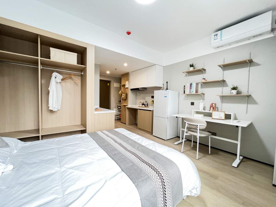 1月6日上午,走进汉悦公寓旗舰店样板间,40平方米的灵动一居室以原木色为主调,房间内厚床垫大床、书桌椅、品牌冰箱空调等一应俱全,还贴心安装了抽油烟机,满足简易烹饪需求。齐全贴心的房间配套,正好满足年轻人拎包入住的需求。