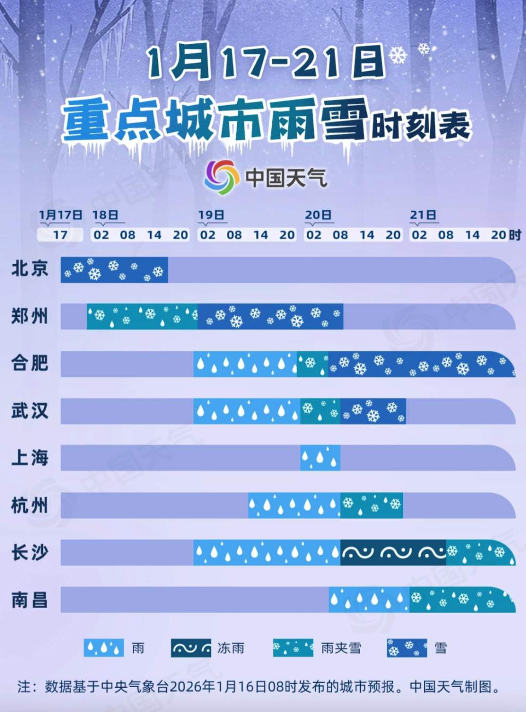 1月19日:白天阴天有小雨,傍晚到夜间冻雨转冰粒或中到大雪,偏北风4到6级,阵风7到9级,气温-2~5℃。