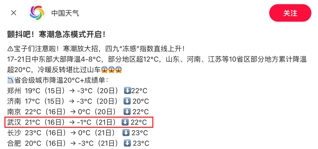 18日夜间至22日,平均气温降幅12~14℃,最高气温将从16~18℃降至-2~0℃,最低气温从3~6℃降至-6~-3℃,20日至22日,日平均气温均在0℃以下,有冰冻发生;