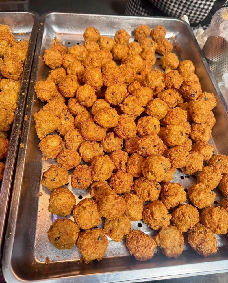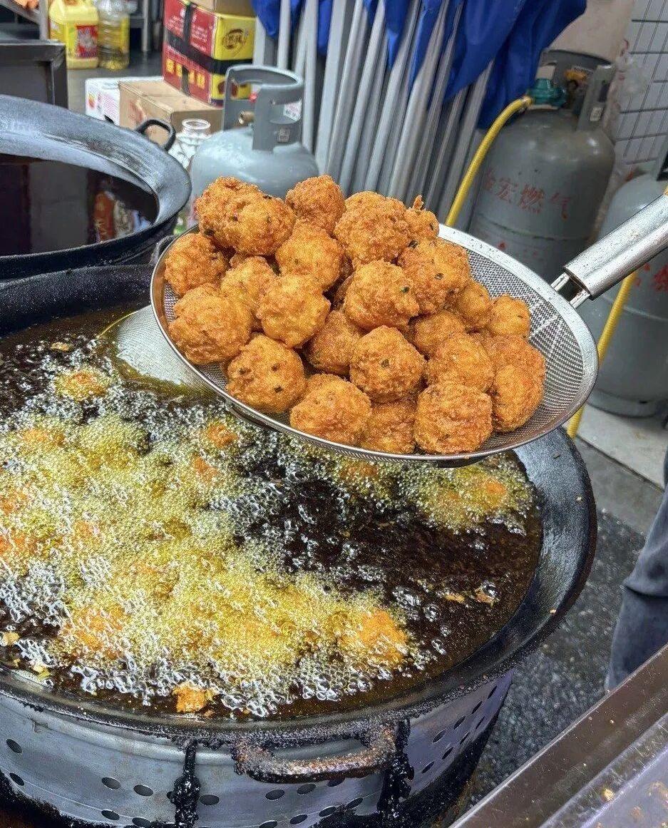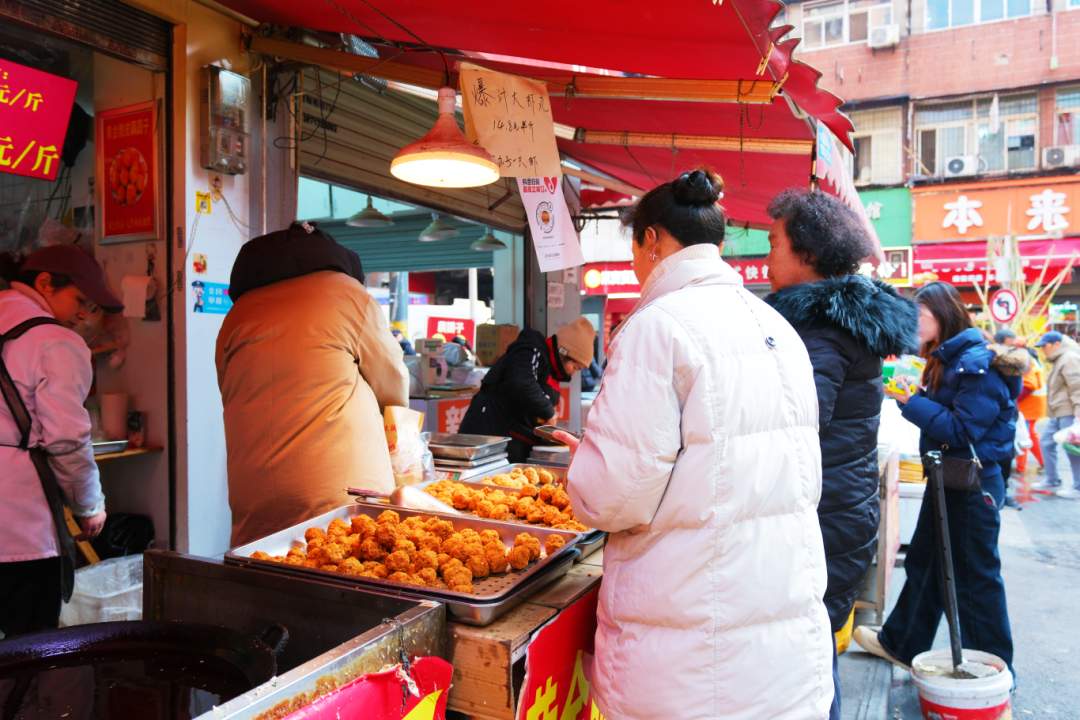 门前支起一口铁锅,锅内热油滚烫。现捏的虾圆子、藕圆子被倒入锅中,泛出金黄光泽、发出滋啦声响。排队的人们,往往能闻到“第一手”肉香。