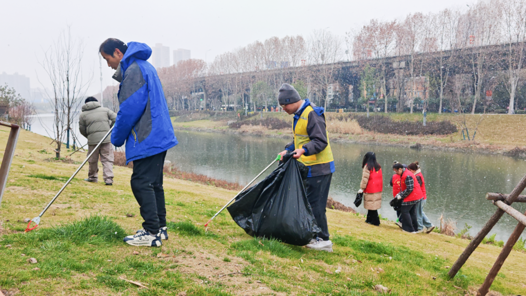 除了居民房前屋后,辖区各职能部门立足本职、协同发力,聚焦群众生活出行重点场景、行业重点领域开展深度清洁,主动配合街道破解环境难题。上午10时许,天空忽降大雪,在黄孝河公园水域沿线,区水务局工作人员联合公园项目部、中一社区志愿者们冒着大雪,有的手持网兜打捞水面漂浮物,有的弯腰清扫岸边枯枝落叶和白色垃圾,全力守护河道洁净与公园整洁。公园项目部党支部副书记介绍说:“借着此次全域清洁行动,我们全面清理河道岸线卫生,做好公园设施维护,也让市民能在干净优美的环境里休闲赏景、喜迎新春。”