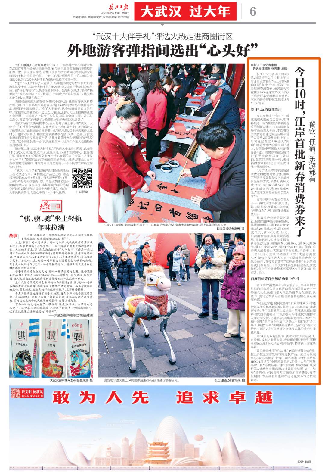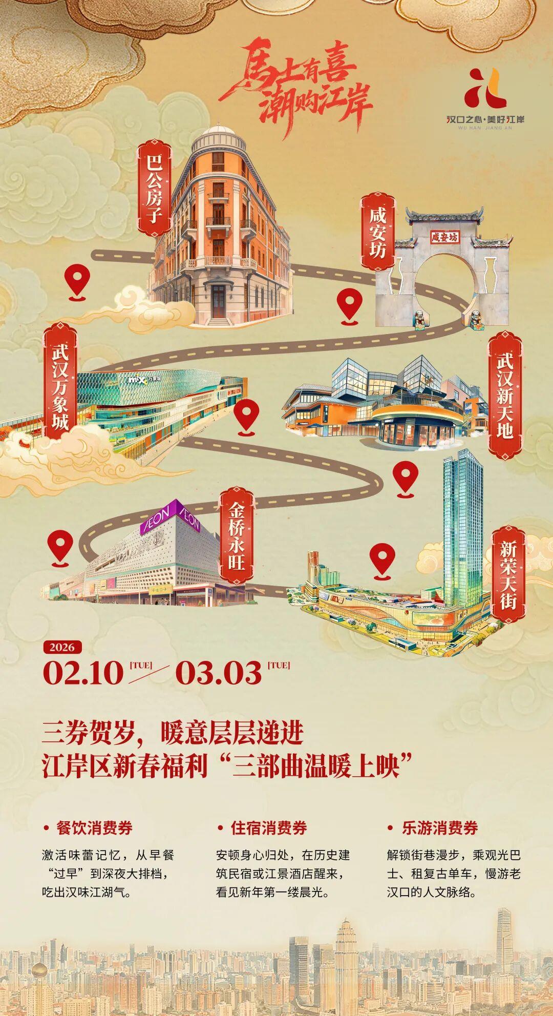 从市井烟火到高端体验,从传统文化到潮流玩法,江岸区新春消费多元场景多点开花、各具特色,遍布全区,市民游客可逛市集、赏年画、观非遗、看展演、品美食。江岸区将以“消费券 + 新场景”深度融合模式,全力撬动春节消费市场,推动消费券红利与新春消费热度双向叠加,让丰富多样的新春活动与惠民消费举措相辅相成,进一步激活节日经济、点燃消费热情。