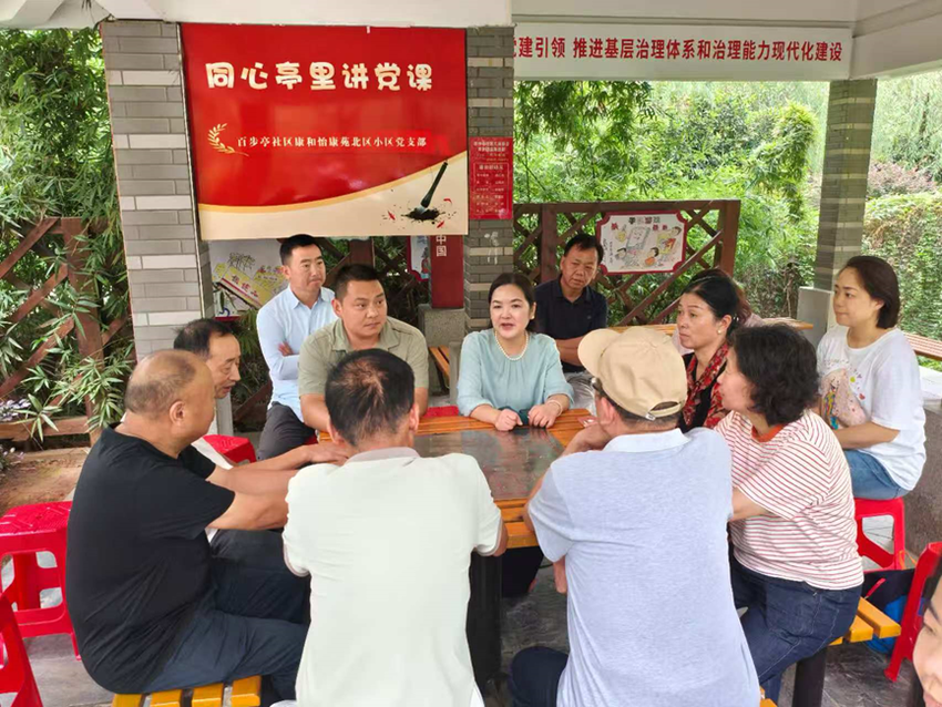长轩岭街道杨田村党员干部走进百步亭社区三居委会小区“同心亭”,与社区同上一堂党课。