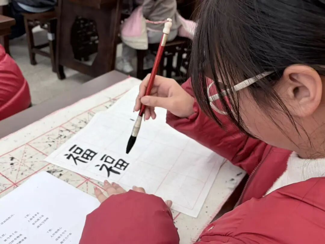 书写环节,教室瞬间被墨香包裹。书法老师手把手指导孩子们握笔、运笔姿势,重点讲解马年春联常用字书写技巧,耐心纠正书写错误。孩子们凝神静气,先在宣纸上反复练习福、春、马等字和简易春联,再换上大红春联纸正式创作,一撇一捺皆藏认真,一笔一划满是新春期许。书法老师现场点评作品,挑选优秀春联张贴展示,红联墨字让教室年味拉满。