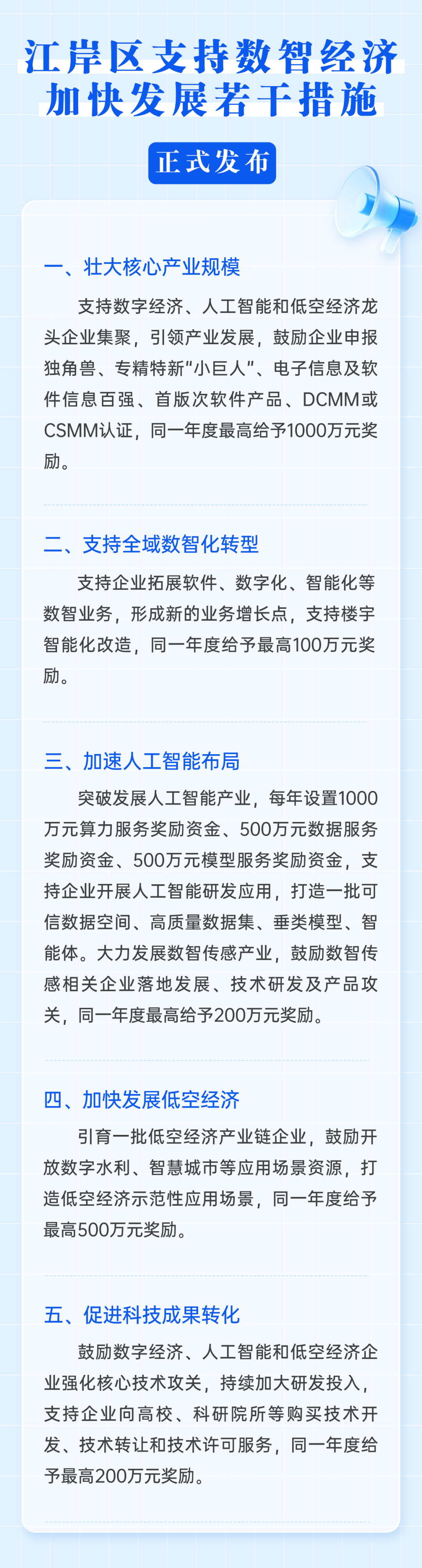 政策聚焦数智经济发展关键领域,从壮大核心产业规模、支持全域数智化转型、加速人工智能布局、加快发展低空经济、促进科技成果转化五大维度精准发力。政策拿出“真金白银”加大扶持力度,每年设置1000万元算力服务奖励资金、500万元数据服务奖励资金、500万元模型服务奖励资金,对符合条件的优质企业,最高给予1000万元奖励,以硬核举措为产业高质量发展保驾护航。