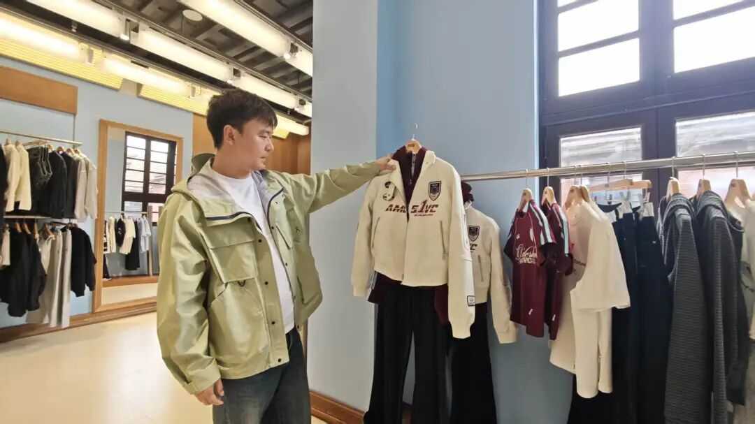 “是一个比较年轻的家庭,整套整套地购买衣服。店里的衣服风格宽松休闲,有设计潮流的适合年轻人穿,也有基础款卫衣可以买给家人。他们搭配了很多套,所以件数很多。”彭兵说,成套搭配销售正是实体服饰店的特色和优势。