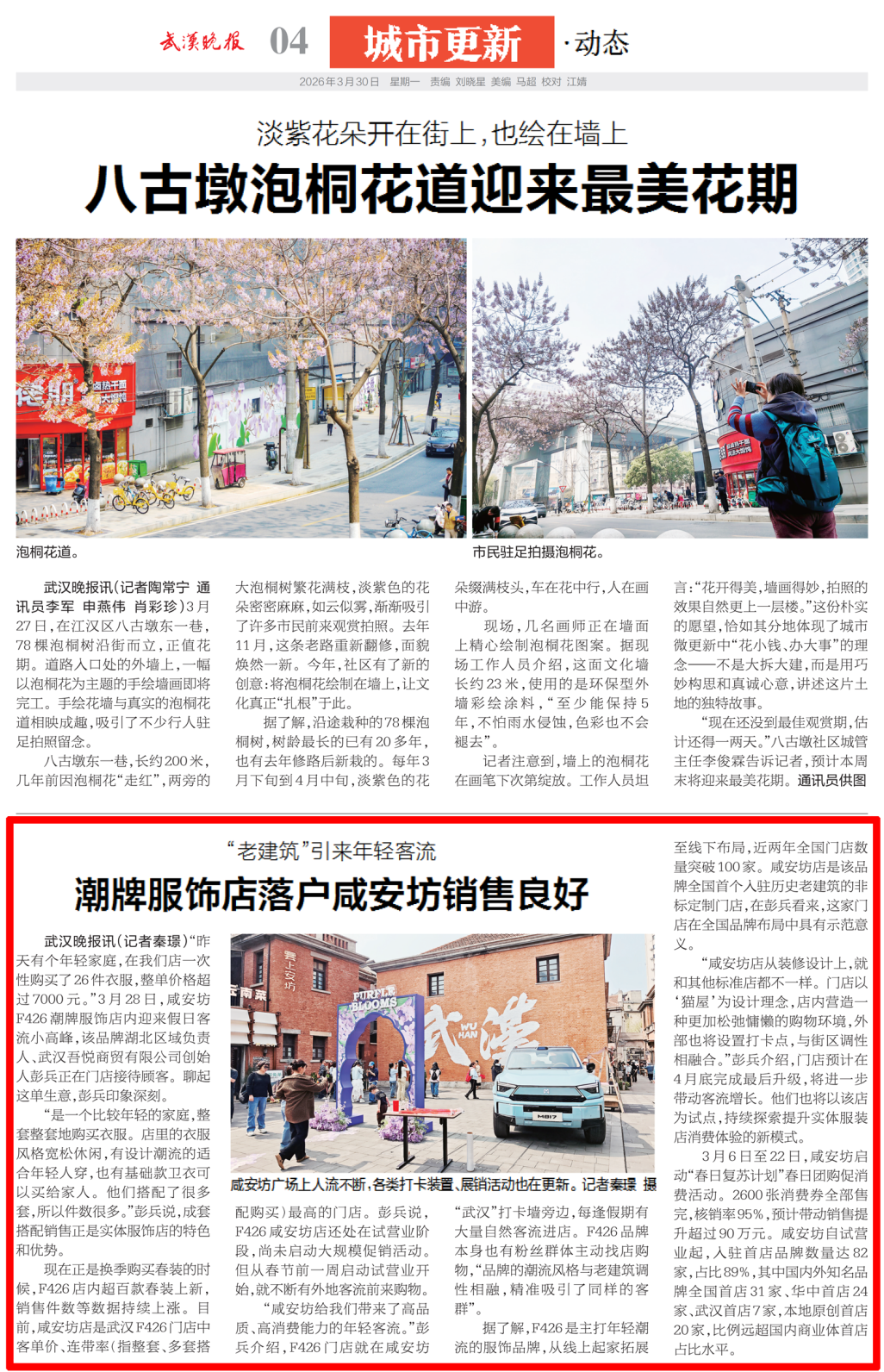 “昨天有个年轻家庭,在我们店一次性购买了26件衣服,整单价格超过7000元。”3月28日,咸安坊F426潮牌服饰店内迎来假日客流小高峰,该品牌湖北区域负责人、武汉吾悦商贸有限公司创始人彭兵正在门店接待顾客。聊起这单生意,彭兵印象深刻。