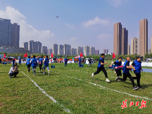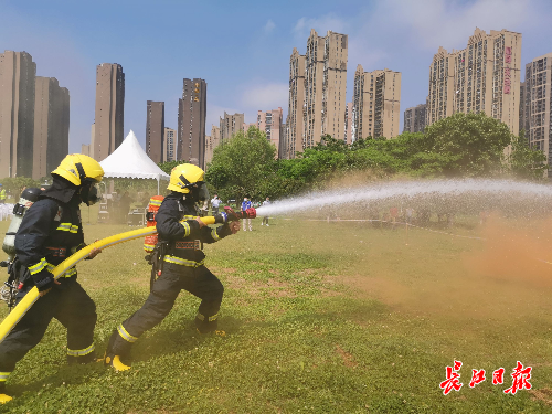 随着裁判员一声令下,队员弯腰,两手各拎起一个重3公斤的灭火器、一个健步冲出起跑线,呐喊声、加油声此起彼伏。5月8日上午,来自江岸区街道(社区)的17支代表队在塔子湖体育中心开展应急技能大比武。
