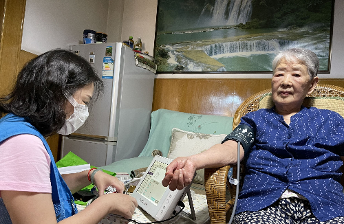 上午,喻亮接到电话,91岁的葛德全老人想理发。由于腰椎间盘突出治疗刚刚出院,行动不太方便,再加上外面气温太高,葛德全打电话向社区网格员求助。她说:“我这出门理个发,要是中暑了不得了,他们蛮好,把理发师带到我家帮我理发,真的是蛮贴心。”早上刚刚理完发,下午负责健康管理的社工就上门为葛老师测量血压,监测健康状况。像这样的高龄老人,只要有什么需求,基本上一个电话联系到网格员那里,社区工作人员或者社工就会上门。